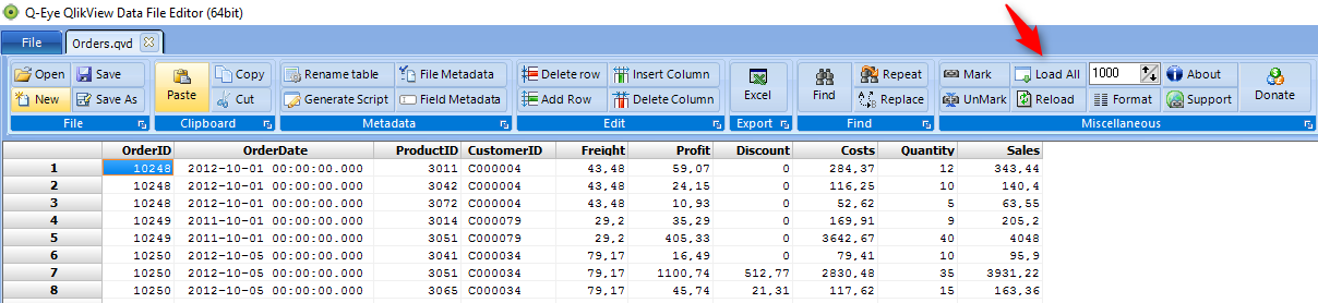 QlikView pozwala na otwarcie bezpośrednie pliku QVD, lecz z ograniczeniem podglądu pierwszych 100 wierszy. I na tym kończy się jego funkcjonalność. Qlik Sense nie otworzy nam wcale pliku QVD z poziomu Windows (jedynie podgląd przy budowie modelu danych). Jeśli chcemy „czegoś więcej” zachęcam do zapoznania się z darmowym narzędziem Q-Eye.